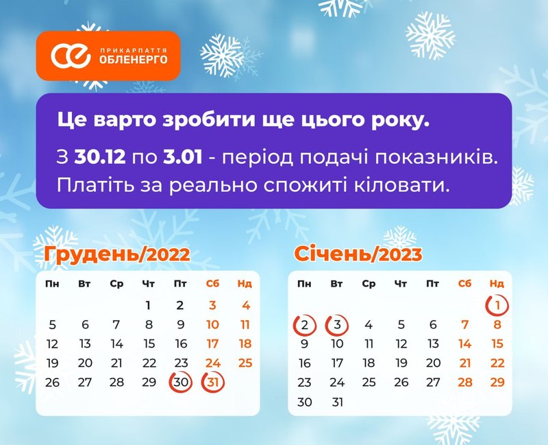 🗓️Нагадуємо, що вже стартував період подачі показів лічильника. Він триває з 30 грудня по 3 січня.