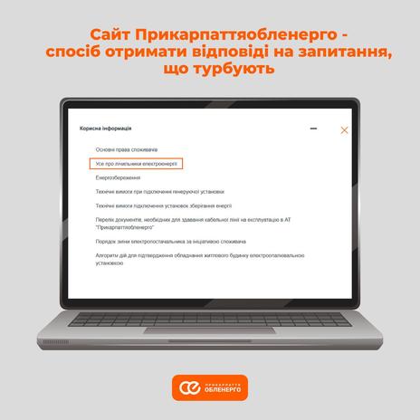 Усю необхідну інформацію можна знайти на головній сторінці сайту АТ «Прикарпаттяобленерго» в розділі Клієнтам – Корисна інформація – Усе про лічильники електроенергії (https://www.oe.if.ua/uk/sections/5e749e28db9c425648a6d000#5bebef08db9c424d57d7f2f4).